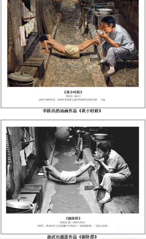 日前,一位PPA(美國(guó)職業(yè)攝影師協(xié)會(huì))成員在網(wǎng)上披露,近期在濟(jì)南參觀“第七屆中國(guó)體育美術(shù)作品展”時(shí),發(fā)現(xiàn)入選的浙江省麗水市油畫(huà)院副院長(zhǎng)李躍亮的一幅油畫(huà)作品《我小時(shí)候》,與陜西省攝影師胡武功的一幅攝影作品《俯臥撐》極為相似。該網(wǎng)友為此特意找到胡武功,問(wèn)其是否有過(guò)委托,回答是否定的。只要將胡武功的攝影原作與油畫(huà)放在一起對(duì)比后,就會(huì)發(fā)現(xiàn)該油畫(huà)的作者只是用顏料代替了銀鹽,用繪畫(huà)克隆了照片?!袄L畫(huà)剽竊攝影的風(fēng)氣該剎一剎了!”該網(wǎng)友的呼吁得到了眾多美術(shù)和攝影愛(ài)好者的呼應(yīng)。