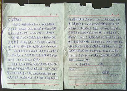 錢學森的這封親筆信共兩頁,圓珠筆書寫,落款時間是1996年6月30日,收信人是當時的國務委員宋健。收藏此信的文敏女士告訴記者,這封信是自己3年前在北京舊書市場上購買到的,當時一起買到的還有幾封名人信札。買回來后,起初也沒有很在意,但后來經(jīng)過閱讀,才覺出此信具有非常高的價值,便一直珍藏至今。從信中內(nèi)容得知,錢老不光研究航天科學,對水的問題也很關心,并提出了很好的建議,而這方面以前很少有人提。現(xiàn)在,錢學森的去世讓所有中國人都感到惋惜和悲痛,這時把這封信公布出來,算是自己對老人表達的一份崇高敬意吧。