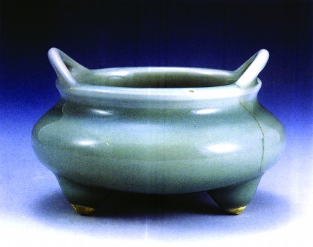 這尊虎眼耳三足香爐,是由景德鎮(zhèn)窯燒制的官窯器,底部有方方正正的六字青花“大清乾隆年制”篆文印章款,非常規(guī)矩。爐身高8厘米,直徑13.5厘米,腹徑8.5厘米,造型古樸典雅,里外滿釉,為豆青釉,釉色勻凈,釉汁肥厚光潤(rùn)。爐足底尖上露有一點(diǎn)點(diǎn)灰白色胎骨,三只乳足上各有一個(gè)小氣洞,仿佛在告訴人們這三足是空心的。從工藝上講,空心足可使香爐更加輕便靈巧,更容易燒透。