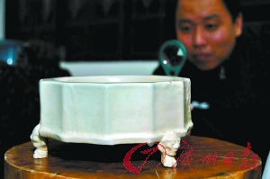昨日下午,得到藏家羅先生特許,本報(bào)記者按要求獨(dú)家拍攝了這件汝窯,并探尋了其中三大傳奇之處,“目前來說因?yàn)槭枪缕?,為了防止仿造,我們禁止任何拍攝,廣州日?qǐng)?bào)拍攝的圖片,是第一張?!迸损^長(zhǎng)說道。