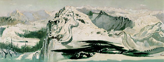這幅作品是吳冠中為北京首都國際機場所繪大型壁畫的畫稿,以北方疆土為主題,表現(xiàn)了中國北方自然景象的氣勢磅礡,糅合了中國筆墨的細膩和西洋油畫的色彩。