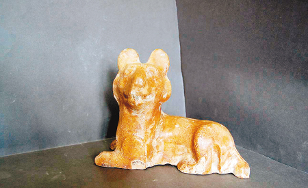 灰陶守門犬 通高9.6厘米,雙耳直豎,雙目前視,頭前伸,四肢呈奔跑狀,尾巴上翻,似發(fā)覺陌生人進入大聲狂吠,以吸引主人的注意,是一只盡責的守門犬。