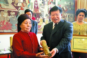 捐贈儀式上,肖大娘將誥命交給國圖副館長張志清。