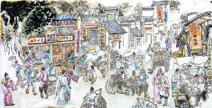 長980厘米,寬70厘米的《大宋書坊圖》規(guī)模宏大,結構嚴謹,畫面從右往左大致分為三個部分:第一部分是書坊郊外圖。路上,馱隊、挑夫,騎馬、坐轎、伐木刻版的人行色匆匆,所運之物多為書籍。第二部分是書坊街頭情景。城中刻坊、書坊林立,街上車水馬龍運送圖書,余氏刻書作坊熱鬧非凡,從寫到刻、印井然有序,當地特色小吃名目繁多。第三部分是朱熹講學畫面。上百名學子不遠千里來到書坊,聽朱子講學,認真傾聽的神情,無不表現出對知識的渴求。畫中五百余人,各種牲畜二十多頭,木船二十多只,房屋樓閣三十多棟,推車乘轎也有二十多件。畫中每個人物、景象、細節(jié),都安排得合情合理,疏密、繁簡、動靜、聚散等畫面關系,處理得恰到好處,繁而不雜,多而不亂。李錚通過對書坊城內建筑、商貿、講學、刻書、磨墨、印刷、運輸幾個方面的描繪,真實再現了當年書坊刻書印刷業(yè)的繁榮景象。