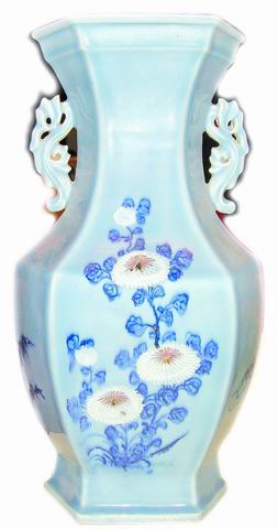 新鄭藏友司先生抱來一件祖?zhèn)鲗氊悺宕{釉雙龍耳六方瓶。不似我們常見的圓形瓶,這件瓶呈六方形,高40厘米,通體是淡雅舒適的藍釉,兩面各以藍、白二色繪制著菊花、蘭花,筆墨清雅,兩邊兩株亭亭的細(xì)竹,枝葉婆娑,迎風(fēng)搖曳。細(xì)看花心,還有些許的暗紅,正是釉里紅。陶瓷鑒定專家李衛(wèi)國老師說,這件瓶是晚清的老物件,在陶瓷收藏中有句話叫“一方頂三圓”,方形器因其制作工藝難度高,比較少見,價值也更高?!傲娑际峭耆止づ某鰜淼呐?,而圓形器可以半手工拉坯”。李老師介紹,這種藍釉是雍正時期才出現(xiàn)的,以純色藍釉為最好,稱作雍正單色釉,這件瓶雖然非常雅致,但釉里紅燒得不是太好,不太紅。本應(yīng)是一對。這件寶貝一是藍釉和器形都少見,一是畫好、品相好,李老師給出的估價為5萬元。