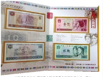 推銷員把記者帶到一個展室中,把裝有等值兌換的第四套人民幣票冊遞給記者,票冊印刷較為精美。全套9張面值的鈔票均為全新,而且后四位確是相同的號碼,記者把鈔票拿出來仔細(xì)查看,確認(rèn)不是假鈔。