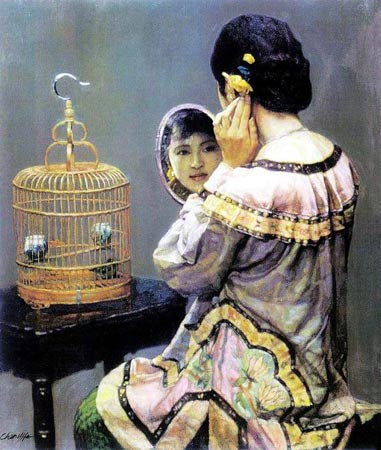 這幅作于1999年的油畫《古風(fēng)悠情》,是陳逸飛成熟期的代表作,有關(guān)這類題材的演示,他曾經(jīng)坦言:“海上舊夢,是我表現(xiàn)和追求的旨趣,這里有歷史的誘因,更有敘不完的情結(jié)所在?!笔堑?,陳逸飛的創(chuàng)作始終是一種由衷舒懷的過程。當(dāng)時(shí)創(chuàng)作《開路先鋒》《渡步》《寒凝大地》《占領(lǐng)總統(tǒng)府》等等精品力作,他借繪畫給人們講敘歷史情結(jié)和內(nèi)心向往,而隨著創(chuàng)作思路的循序漸進(jìn),人心思變。他赴美后的轉(zhuǎn)折相當(dāng)說明一個(gè)問題,人在另一個(gè)國度能夠靜下心來回望自己民族的優(yōu)秀底蘊(yùn),那時(shí)你會(huì)非常自豪地發(fā)現(xiàn),文化的淵源和永遠(yuǎn)纏綿的脈系,它會(huì)不時(shí)閃現(xiàn)在異國他鄉(xiāng),那是根的光環(huán)作用。陳逸飛緊緊抓住了瞬間意念,創(chuàng)作出一批佳作,歸納為海上舊夢系列。讓讀者欣賞的同時(shí),他也隨之步入了一個(gè)新的高點(diǎn)。高處不勝寒,陳逸飛懷著是對人對己負(fù)責(zé)的態(tài)度,畫自己喜歡的畫,走自己崇尚的路。