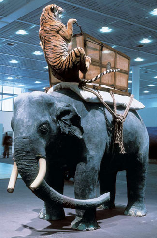 2009 年底,黃永以《方舟2009》為題在巴黎舉辦個(gè)展。剛剛過(guò)去的2009 年無(wú)疑是個(gè)讓人膽戰(zhàn)心驚的年份,全球經(jīng)濟(jì)危機(jī)、迪拜金夢(mèng)破裂、地震、死亡……黃永以2009 年為背景,運(yùn)用他自90 年代起常用的動(dòng)物材料,在巴黎美院那座古典的教堂里,用宣紙糊了一艘被撞癟了一條船,船上都是動(dòng)物,它們?cè)谶@艘所謂方舟的空間里,根本就是危機(jī)四伏,讓觀者不寒而栗。
