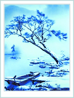 《霧鎖寒江》堪屬其中的佳作。這幅青花瓷版畫(huà)畫(huà)面由近及遠(yuǎn),只見(jiàn)近處白雪皚皚,柔軟地覆蓋著碼頭和江面靜泊的小船,船上立著兩只鳥(niǎo)兒,它們與周?chē)鷪?jiān)強(qiáng)挺立的野花雜草,一同為這靜謐的雪中之景注入一線(xiàn)生機(jī);不遠(yuǎn)之外,一棵沙樹(shù)從右至左側(cè)彎,橫跨畫(huà)面中心,盡管枝干被雪覆蓋,仍不失蒼勁有力;遠(yuǎn)處是伶仃直立的一棵小樹(shù),小樹(shù)背后,濃霧鋪滿(mǎn)江面。遠(yuǎn)近一比照,仿佛大霧背后還別有洞天,連筆者也不禁想要穿越迷霧,繼續(xù)探索背后的桃花源。