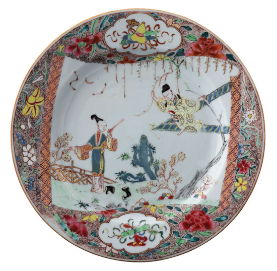 從工藝上看,清代外銷瓷中有一些非常精美的高檔瓷器。目前正在首都博物館舉辦的《清代外銷瓷展》中的《清雍正粉彩仕女采桑圖盤》即是其中一件。胡雁溪認(rèn)為,該盤繪圖極其精美,眾多仕女神形兼?zhèn)?,配景中的房舍器具、樹石圍欄無不精細(xì)入微,“畫工的水平比官窯不差,完全就是一個(gè)很高明的畫家的一幅畫。”