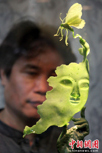 5月6日,臺(tái)灣玉雕大師黃福壽的代表作《悟》亮相“化母愛(ài)為寶島之愛(ài)-送愛(ài)到災(zāi)區(qū)慈善義賣(mài)記者會(huì)”。該作品取材自一塊約30公斤重的碧玉,耗時(shí)2年,目前僅1斤重,栩栩如生,令人叫絕。黃福壽稱靈感來(lái)自禪,“那淺淺的微笑,深藏在玉石里,像是花的綻放”。中新社發(fā)董會(huì)峰攝