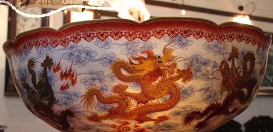 在工作人員的燈光配合下,記者看到大碗正中的主龍和碗壁的龍相輝映,氣勢磅礴,艷麗絕倫,其手法和意境令人嘆為觀止。