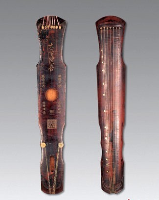 這件由中國(guó)著名文物鑒賞家王世襄舊藏的“大圣遺音”古琴為伏羲式, 桐木胎,鹿角沙漆灰,色紫如栗殼,金徽玉軫,圓形龍池,扁圓形鳳沼。七徽以下弦露黑色,遍體蛇腹斷紋,中間細(xì)斷紋,額有冰紋斷。圓池上刻草書“大圣遺音” 四字,池內(nèi)納音左右上下四隅分刻隸書“至德丙申”四字年款,至德丙申為唐肅宗元年(公元756年)中唐之始,池兩側(cè)刻隸書“嶧陽(yáng)之桐,空桑之材,鳳鳴秋月,鶴舞瑤臺(tái)”十六字,池下有“困學(xué)”、“玉振”兩方印,以上除年款外皆髹金。青玉軫足,細(xì)鏤絳結(jié)及旋瓣花紋,為明朝所制。迄今已近一千二百五十年,傳世既久,琴之足孔四周漆多剝落,木質(zhì)亦接近朽蝕。足端雖纏裹織物并嵌塞木片仍難固定。張弦稍緊,既有損琴背虞,幸好管平湖先生有安裝銅足套之法,為此王世襄先生特請(qǐng)銅器修復(fù)專家高英先生制作銅套并仿舊染色,再請(qǐng)金禹民先生鐫刻八分書題記“世襄、荃猷,鬻書典釵,易此枯桐?!笔?。又請(qǐng)管先生安裝銅足套于孔內(nèi),不僅天衣無(wú)縫,且琴音絲毫無(wú)損,效果極佳。管先生曾笑曰:“又至少可放心彈五百年了?!北本┕蕦m博物院所藏神農(nóng)氏唐琴,不僅琴名“大圣遺音”與此琴完全相同,漆色、斷紋、池沼、年款也絕為相同。因而兩琴應(yīng)制于同時(shí),出自同手。