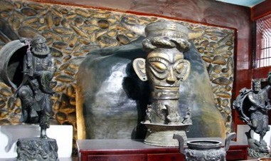 在這個(gè)銅鼓收藏館,有一個(gè)“鎮(zhèn)館之寶”,陳耀靈稱(chēng)之為“銅鼓王”,相傳是第一個(gè)鑄造銅鼓之人,后人將他當(dāng)作神來(lái)供奉,“銅鼓王”的兩側(cè)分別站立著“守鼓神”和“護(hù)鼓神”,栩栩如生。