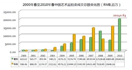 此外, 一份由歐洲美術(shù)基金會(huì)(TEFAF)在近日發(fā)布《2010全球藝術(shù)市場(chǎng):危機(jī)與復(fù)蘇》的報(bào)告指出,各拍賣行和委托人在2010年都耳濡目染了中國(guó)富有買家數(shù)量和藝術(shù)品價(jià)格的驟升??梢哉f,中國(guó)藝術(shù)市場(chǎng)在2010年驅(qū)動(dòng)了全球藝術(shù)市場(chǎng)的復(fù)蘇。報(bào)告估計(jì)2010年全球藝術(shù)和古董市場(chǎng)的價(jià)值達(dá)到了430億歐元(約合600萬美元),比遭受金融危機(jī)創(chuàng)傷的2009年上升了百分之五十二: