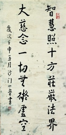 款署弘一法師的圖1書法成品,初看外表給人的印象似乎很“陳舊”。但只要近距離觀察該成品中松懈顯失嚴謹?shù)墓P線以及字形與章法組構(gòu)的生硬唐突狀態(tài),內(nèi)行人就一定不會相信那會是暑名者的真筆。在此,筆者要告訴大家辨識此類偽作的一個小竅門:當觀者用手去觸摸它時,如果整個裱件像布一樣疲軟無“硬”質(zhì),同時成品紙料與裱材的銜接處有殼起、毛邊不平實的現(xiàn)象,那跑不掉就是屬于“問題裱件”。真正的“原裝老裱”不論多么陳舊,都應該是富有彈性,手感相對挺刮,紙與裱材的接縫處必是服帖而嚴整的。圖2是近些天筆者在上海某拍賣行見到的一件系真實“原裝老裱”的弘一法師真跡作品局部,只要大家多看它那么幾眼,相信就能明白裱件的真?zhèn)蔚降资窃趺椿厥铝?。因此說,書畫的真?zhèn)舞b定就像看人一樣,千萬不能只在乎其“穿著打扮”。
