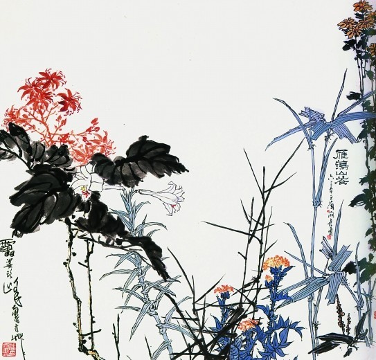 《雁蕩山花》表現(xiàn)的是雁蕩山中一些雜生在山巖間的山花野草,雙勾畫花,花草枝葉疏密聚散、穿插揖讓,用筆剛勁秀麗,畫面虛實(shí)的處理自然,設(shè)色絢麗,塑造了一派生機(jī)的景致,融入了畫家青少年時(shí)代的生活感受。