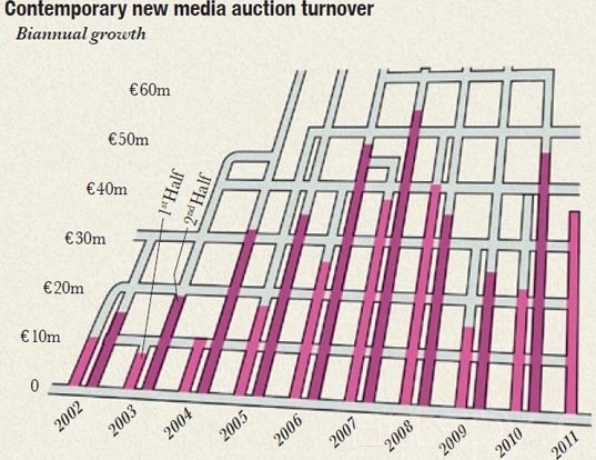 大部分新媒體藝術(shù)的作品都是在紐約和倫敦賣出去的,其拍賣收益大概占到了總數(shù)的87%;有意思的是,作為歷史上攝影誕生地的法國(guó)卻只產(chǎn)生了3.4%的拍賣收益,剛剛領(lǐng)先于近年來迅速增長(zhǎng)起來的中國(guó)(2%)。很顯然,新媒體在歐洲與美國(guó)的市場(chǎng)是很強(qiáng)勁的,在中國(guó)的市場(chǎng)上也正迅速發(fā)展著:香港佳士得與北京誠(chéng)軒拍賣有限公司在這一領(lǐng)域就取得了很好的成績(jī)——事實(shí)上,在全球新媒體藝術(shù)拍賣結(jié)果的50強(qiáng)中,它們是唯一兩間在倫敦與紐約之外上榜的拍賣行。