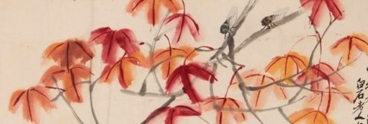 《紅楓鳴蟬》中最引人入勝的是匍匐在葉間枝干上的兩只鳴蟬,畫的極為工細,甚至可透過透明的蟬翼看到腹背部,有的地方甚至比真蟬還細,雖極度逼真,但絕不是簡單平庸地對自然景象的模擬再現(xiàn),而是有意識地提煉概括。兩只蟬也是大相徑庭,設(shè)色上一只輔以三青,一只賦之赭石,一冷一暖,既有對比又遙相呼應(yīng)。白石老人的工筆草蟲用筆工細而不板滯,松秀沉靜而又靈動自如,用墨潔凈透明,用色典雅,濃淡變化自如,工筆畫中帶有文人寫意畫的韻致?!都t楓鳴蟬》是齊白石兼工帶寫的筆意,在粗細對應(yīng)大小對比,紅黑映襯互托,展現(xiàn)了齊白石所擅的,充滿自然生活的情趣意韻,給人以無盡遐想,不絕的享受。這是齊白石闊筆花卉,工細草蟲,巧妙結(jié)合的成功之作。齊白石在工筆畫技法的許多創(chuàng)新與運用是一般畫家難以做到的,達到了徐悲鴻所贊美的“盡精微, 致廣大” 之境界, 體現(xiàn)出白石老人數(shù)十年的繪畫功力、學(xué)養(yǎng)、敏銳的觀察和表現(xiàn)能力以及長期的農(nóng)村生活基礎(chǔ)。