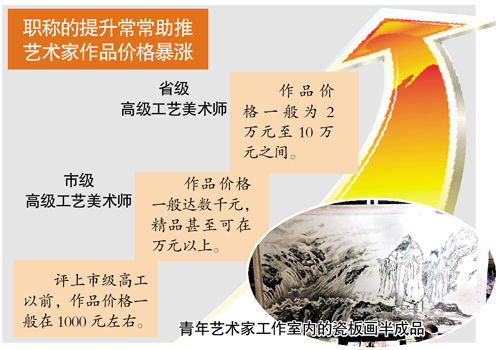 職稱并不是衡量一個(gè)作者價(jià)格的唯一標(biāo)準(zhǔn),比如最近作品拍出200多萬元的白磊,就幾乎沒有任何職稱。但是,職稱是界定一個(gè)作者的藝術(shù)成熟程度的標(biāo)準(zhǔn)之一,一般來說,作者在評(píng)上市級(jí)高級(jí)工藝美術(shù)師前,一般作品價(jià)格在1000元左右,部分精品的價(jià)格會(huì)更高。當(dāng)其成為市高工作品價(jià)格一般可達(dá)數(shù)千元,精品甚至可在萬元以上。而當(dāng)作者成為省高工,其作品價(jià)格一般為2萬元至10萬元之間,這個(gè)區(qū)間較大的原因是要看具體作品的藝術(shù)造詣。而戴文輝認(rèn)為,藝術(shù)家作品價(jià)格上漲,還有整個(gè)景德鎮(zhèn)藝術(shù)陶瓷整體行情向上的原因。