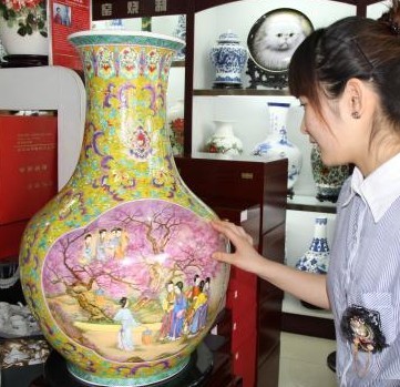 記者看到,這個高820毫米,寬520毫米的粉彩骨瓷天球瓶瓶身以金色為底,瓶上繪有紅紫二色纏枝蓮,色澤艷麗。瓶身兩側(cè)由中國工筆畫《采蓮圖》、《觀梅圖》構(gòu)成,瓷質(zhì)細膩通透,器形美觀而典雅。