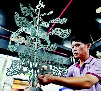 其次是鑄造難度大。方國(guó)榮說(shuō),四川、重慶等地的搖錢(qián)樹(shù)枝葉,厚度通常為2毫米,我省出土的只有1毫米,加上造型結(jié)構(gòu)復(fù)雜細(xì)密,鑄銅時(shí)銅水流路狹窄,必然導(dǎo)致鑄造缺陷多;再者是鑄造為銅件后,枝葉紋飾再加工耗時(shí)多。為使復(fù)制枝葉能再現(xiàn)原件效果,他使用了許多修復(fù)青銅器的手段來(lái)對(duì)鑄件進(jìn)行后期處理。最終,經(jīng)過(guò)半年的古法冶煉、鑄造,搖錢(qián)樹(shù)復(fù)制完成。