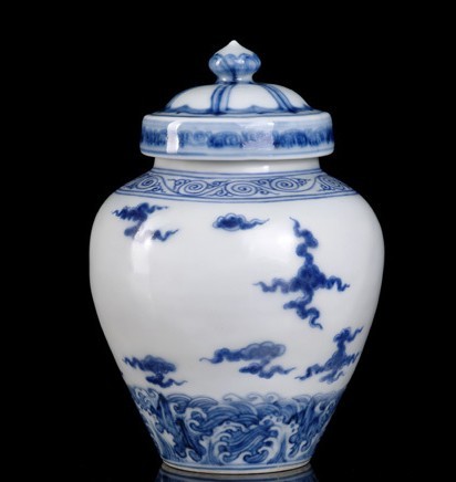 成化瓷器以玲瓏秀奇,為世所珍。此件成化青花海水云紋罐存世稀少,與(《徐氏藝術(shù)館》徐展堂藏明清瓷器展覽圖錄,圖72,明成化青花波濤云紋罐)相比較,紋飾相同。青花呈色淺淡柔和,典雅宜人,云紋采取雙線勾勒填色繪制技法,筆觸秀麗,清新悅目?!吨駡@陶說》評曰:“成窯畫筆古今獨步,蓋丹青妙手寄其心力于瓷片之上,故能筆細(xì)如發(fā),用青如用墨,點染描畫,各臻其妙也?!?br/>