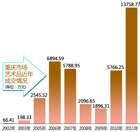 謝援朝的說法有充分的數(shù)據(jù)證明。重慶市拍賣行業(yè)協(xié)會(huì)提供的統(tǒng)計(jì)數(shù)據(jù)顯示,去年是重慶藝術(shù)品拍賣市場(chǎng)最紅火的一年,總成交額達(dá)到1.3758億元。這是重慶藝術(shù)品拍賣市場(chǎng)自2002年有統(tǒng)計(jì)以來成交額首次上億。而同年,北京藝術(shù)品拍賣的總成交額為431.4億元,成都則為2.6556億元。