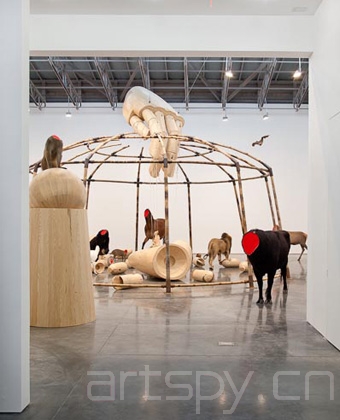 在這場(chǎng)展覽中,黃永砯使用了經(jīng)過(guò)標(biāo)本剝制術(shù)處理的動(dòng)物這一在其早期作品中便有呈現(xiàn)的材料,展出的三件裝置作品探索了時(shí)間、混亂的概念以及宗教與權(quán)力之間的關(guān)系。在主展廳中展出的作品“Circus”由一只巨大的“木手”提著一個(gè)竹編的圍欄組成,圍欄內(nèi)外像是有12只沒(méi)有腦袋的動(dòng)物正在上演一場(chǎng)“木偶戲”一般。它們的脖子上揚(yáng),仿佛都在“凝視”一具身著長(zhǎng)袍的猴子的骷髏——后者受到了中國(guó)古典小說(shuō)《西游記》中的孫悟空的啟發(fā)——骷髏的手中則提著一個(gè)更小的木偶。這種茫然呆板的“神”與被其迷住的觀眾之間的對(duì)比指明了一個(gè)問(wèn)題:誰(shuí)或是什么在這里起支配作用;這同時(shí)邀請(qǐng)了觀眾再次衡量其對(duì)各種關(guān)系的理解——比如與他人的關(guān)系,與他/她所生存的世界的關(guān)系。