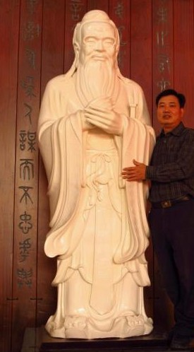 矗立在德化縣文廟的該尊孔子瓷雕塑像,高2.219米、寬0.86米,重達(dá)600多斤,造型豐滿、面容莊嚴(yán)、溫潤白潔,以唐代大畫家吳道子的孔子畫像為藍(lán)本。