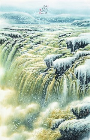 觀王世利繪畫,黃河題材尤其有震撼力。立于畫作之前,“黃河之水天上來”的氣勢,不由得觀者不“心鼓雷動”。這種“雷動”不僅來自于洶涌翻滾而來的黃水白霧,也不僅來自于險(xiǎn)要奇絕的黑石深谷。于畫面之外,似乎還聽見在河壩上、在黃土坡上,一群赤裸上身、汗流浹背的黃河兒女,正擂動巨大的英雄鼓,把黃河水激昂。