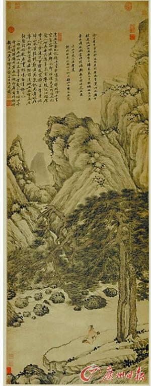 《虎丘送客圖》的畫面描繪了一位文士臨流坐于長松之下,停琴觀泉的情景。圖中遠山險峻,樹木蔥郁,近處古松如蓋,泉流湍急。靜觀此圖似可聞流水潺潺,松濤陣陣,呈現(xiàn)出一派放逸閑適的生活狀態(tài),中國文人士大夫瀟灑隨性的生活態(tài)度自然流露。整個畫面布局疏朗有致,筆墨細(xì)膩秀逸,長披麻皴繪山石,筆法蒼勁,蒼松則以爽健之筆寫出。人物雖較小并僅位于畫面下方,卻以朱色染衣,使其形象立時于畫面中突出。沈周還于畫上題寫五言長詩一首,其上更有當(dāng)時的文士吳寬的題詩。詩、書、畫相映,成就了沈周這一曠世杰作。
