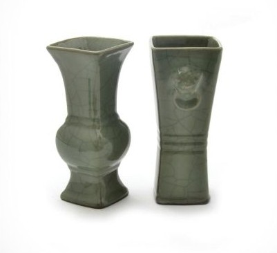 花觚撇口,長方頸,鼓腹,高脛,近底處外撇,通體施青釉 此瓶釉面肥厚潤澤,閃現(xiàn)一種酥油般光澤,具有獨特的藝術(shù)魅力。在造型上也頗具特色,器身于穩(wěn)重端莊中以凹凸變化的弦紋線條突出其精巧。