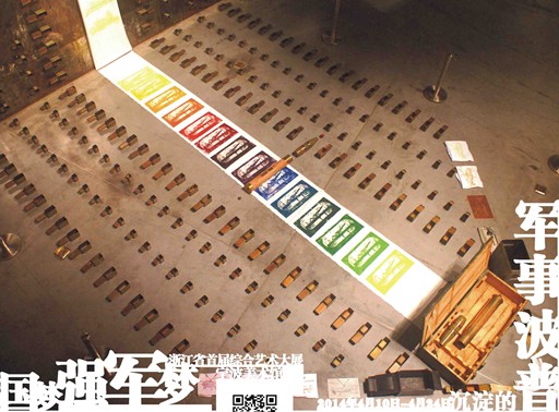 這件作品利用空的彈藥箱盒,打開蓋子,利用“重復(fù)”的原則把他們以大數(shù)量地整齊排開,以表達(dá) “井噴”的主題;拆解的模型彈,以增加沖擊力和力量感;軍事題材銅版原板,切入主題地表達(dá)兵器制造如同版畫一樣的“復(fù)制性”特點(diǎn);最具震撼力的就是利用空彈殼的銅質(zhì)地,將其施加蝕刻的手段,制作出軍事題材的銅管凹版版畫,并將其印制在布上,如同彈殼在不停滾動(dòng),印出精美的國產(chǎn)高精尖兵器圖案,體現(xiàn)出兵工科技如同彈殼到尖端兵器的階梯式、積累式的發(fā)展和其制造的復(fù)制性特征。利用上述材料和手段來表達(dá)“強(qiáng)軍夢(mèng)”的主題,材料、手段和主題緊密結(jié)合。