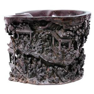 這個(gè)木筒高24厘米,產(chǎn)于公元18到19世紀(jì)清朝乾隆年間,用一整塊紫檀木雕刻而成,應(yīng)是用來放置毛筆的筆筒。筆筒外面雕有百子圖,雕工十分精細(xì),皇室家庭專用。
