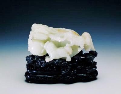 太獅威武莊嚴(yán),少獅溫馴可愛(ài)。獅身毛發(fā)雕刻精細(xì),流暢自然,布局疏朗,不失為清代玉器的優(yōu)秀作品。配有紫檀木座。