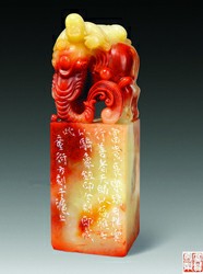 印章雖無書法之揮灑自如,少繪畫之色彩明暗,卻另有一種古樸和渾厚情致。方寸間靈動之文字,朱白之相宜,縱橫之章法,淋漓盡致間,展現(xiàn)出耐人玩味的古雅 逸趣。特別是隨著文人雅士的愛好興起,一種刻有各種詩句、警句、格言印章開始大量出現(xiàn)在書畫作品的題字和押角處,使之成為書畫作品構(gòu)成的有機部分,增添了 藝術(shù)感染力。