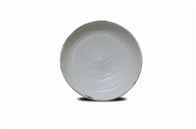 鎮(zhèn)江揚中永鑫堂藏定窯白釉刻劃水波雙魚紋洗(見圖),高2.2厘米,口徑12.7厘米,底徑8.3厘米。包銀口,淺腹,平底。內底刻劃水波雙魚紋,以細密的水波紋作地紋,雙魚在水中游動,畫面簡潔,刀法嫻熟。魚紋出現在古陶器裝飾上,已有六千年的歷史。魚有產卵多的特點,是古民們祈愿氏族和子孫繁衍的象征。同時魚是“余”的諧音,以魚來祝愿年年有余。在景德窯、耀州窯宋瓷上魚的形象都有表現。此器胎呈灰白色,較細膩,胎釉結合緊密,釉層薄,釉色白中微泛黃,底部有竹絲刷紋及淚痕,這是因為釉料的原因,其釉在高溫下產生流淌現象,俗稱為“淚痕”。