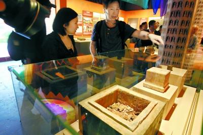 進(jìn)入主展廳內(nèi)一間單獨(dú)辟出的內(nèi)室,光線立刻暗了下來(lái)?!斑@里展出的是房山石經(jīng)刊刻開(kāi)山祖師靜琬的千年靈骨。因?yàn)槲奈飳?duì)照明光線有特殊的要求,所以特別設(shè)計(jì)了一間暗室來(lái)展出文物?!惫ぷ魅藛T解釋說(shuō)。記者看到,靜琬石函為一素面石函,函身呈長(zhǎng)方形,上有函蓋,無(wú)銘文記載。靜琬的千年靈骨就靜靜放置在石函面前。