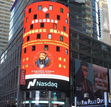 納斯達(dá)克大屏幕作為紐約時(shí)代廣場(chǎng)的標(biāo)志性建筑物,其播放內(nèi)容被廣泛關(guān)注,這次孔夫子像現(xiàn)納斯達(dá)克大屏幕,是中國(guó)內(nèi)地一家企業(yè)助力廣東藍(lán)態(tài)公益基金會(huì),共同推廣傳統(tǒng)文化而推出的“創(chuàng)意”。