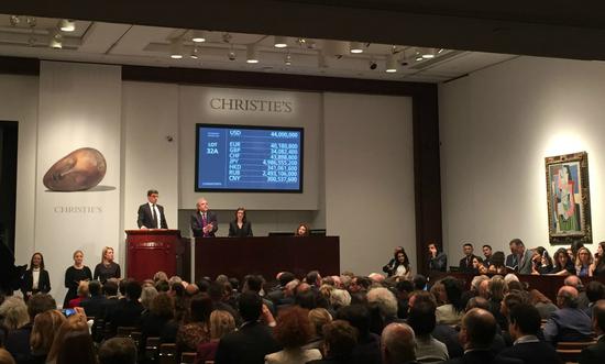 作為當晚最大的懸念,現(xiàn)代主義雕塑大師康斯坦丁?布朗庫西的卵形雕塑《沉睡的繆斯》估價在2500萬至3500萬之間,一度引發(fā)了當晚漫長的拉鋸戰(zhàn)。充滿戲劇化的是,在喊價至3400萬時,坐在觀眾席中間,頭戴耳機正在通話的前蘇富比(微博)當代藝術負責人、頂級拍賣師Tobias Meyer突然加入“戰(zhàn)局“,讓在場人士有些驚訝,最終這件作品以5100萬美元落槌。在拍賣結束以后,有人猜測Meyer電話那頭的人是媒體大鱷David Geffen,不過這個謠言被其本人否認。