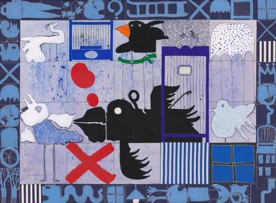 此次展覽的16件西爾萬(wàn)作品,均為左右美術(shù)館及其藏家委員會(huì)通過(guò)比利時(shí)雄獅畫(huà)廊收藏,并借比利時(shí)公主訪華履行“公主的使命”之際在北外灘黃浦江畔的建投書(shū)局展出,希望將西爾萬(wàn)的原作展示在國(guó)人面前,而非只是在網(wǎng)上人云亦云。在這16幅作品中,我們也看到了西爾萬(wàn)和葉永青相似和不同的地方。此次展出的16件作品均為“丙烯絲網(wǎng)畫(huà)”,何為“丙烯絲網(wǎng)畫(huà)”,據(jù)喬斯介紹,是畫(huà)面的黑白部分先用絲網(wǎng)印刷,然后用丙烯顏料在絲網(wǎng)印刷的紙上再加工,其實(shí)就是綜合材料。而細(xì)看這些作品,畫(huà)面上的確有平面的印刷和有丙烯的厚度,且除了在葉永青畫(huà)面上也可以看到的格子構(gòu)圖、紅叉叉、紅墨點(diǎn)、黑鳥(niǎo)等元素外,西爾萬(wàn)還有一些更多彩自由的畫(huà)面。這也同時(shí)讓中國(guó)公眾看到多個(gè)類型的西爾萬(wàn)。