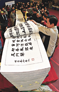 超過(guò)萬(wàn)尺長(zhǎng)的唐詩(shī)三百首書(shū)畫(huà)冊(cè)21日于灣仔修頓室內(nèi)運(yùn)動(dòng)場(chǎng)展示﹐是一千八百五十三位長(zhǎng)者及愛(ài)好書(shū)畫(huà)人士共同書(shū)寫的成果﹐并將向健力士大全申請(qǐng)列為世界最長(zhǎng)書(shū)畫(huà)冊(cè)。