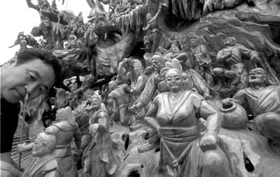 一座刻有水滸人物一百零八將的巨型根雕作品,在北京東郊蔬菜水果批發(fā)市場(chǎng)即將開(kāi)始的奇石、盆景展上亮相。這座長(zhǎng)490厘米、寬160厘米、高310厘米、重3噸、材料為紅葉細(xì)樟樹(shù)根的根雕,是一位廣西的根雕愛(ài)好者,邀請(qǐng)了三位當(dāng)?shù)刂翊髱?,歷時(shí)一年精心雕刻完成的。這座巨大的根雕售價(jià)為108萬(wàn)元人民幣。(王杰 攝 北京娛樂(lè)信報(bào))