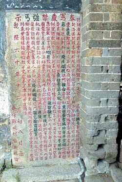 那塊石碑鑲嵌在古村大門西側(cè)的廂房墻內(nèi),采用青石雕刻而成,文字用了紅、黑兩種顏色的涂料。不過有意思的是,記者讀完全文發(fā)現(xiàn),凡是貶義詞,比如說“強(qiáng)丐”、“匪徒”等詞都采用黑色涂料。從碑文落款來看,碑上的告示是乾隆六十年所發(fā),距今已有200多年歷史。