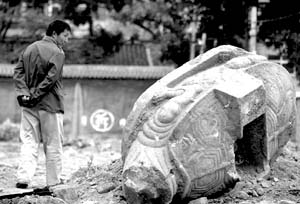 石刻藝術(shù)館專家來到全國政協(xié)禮堂東側(cè)的拆遷工地,對近日施工中挖出的斷頭漢白玉石龜進行了鑒定,認定其為明代五趾青石龜趺,有很高的文物價值。