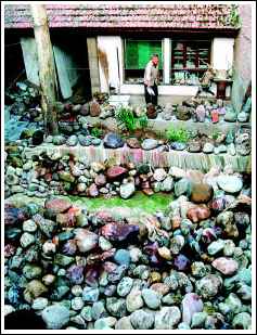 當(dāng)問(wèn)到老人平時(shí)都是怎樣處理這些石頭的,老人一下子來(lái)了興致,他走到小獨(dú)院中間,一邊給他那些心愛(ài)的石頭澆水清洗,一邊給記者介紹說(shuō):“這些石頭都是我從涇河里撿回來(lái)的,現(xiàn)在這里的石頭基本上都是當(dāng)初的模樣沒(méi)有改變,我撿回來(lái)后第一道工序就是先給它們‘洗澡’,然后再用砂石將它們磨得光亮圓滑,最后再在它們的表面上涂上一層凡士林或是蠟油,因?yàn)槭怯^賞石,所以要顯得有光澤嘛!可以說(shuō)這些石頭和我以前弄的那些根雕就是我現(xiàn)在的生活寄托??!”
