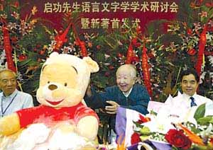前天是當(dāng)代國(guó)學(xué)大師啟功先生92歲壽辰。為了給啟老祝壽,北京師范大學(xué)在該校舉辦了“啟功語言文字研討會(huì)暨新著首發(fā)式”。在壽宴上,啟老對(duì)送給他的維尼熊情有獨(dú)鐘。據(jù)童慶炳先生透露,年事已高的啟功腿腳不夠靈便、視力與聽覺欠佳,由于體力不支,寫字、畫畫手發(fā)抖,已提不起筆。對(duì)于之前媒體傳出重寫王羲之《蘭亭序》一事,啟功的學(xué)生趙仁珪教授給予否定。